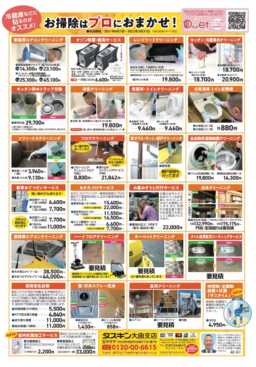 ダスキン大曲支店は、創業50年、ダスキンフランチャイズチェーン加盟店 株式会社ヤマダ で、秋田県大仙市地域の家庭・お店・オフィス等のご愛顧得て順調に推移している会社